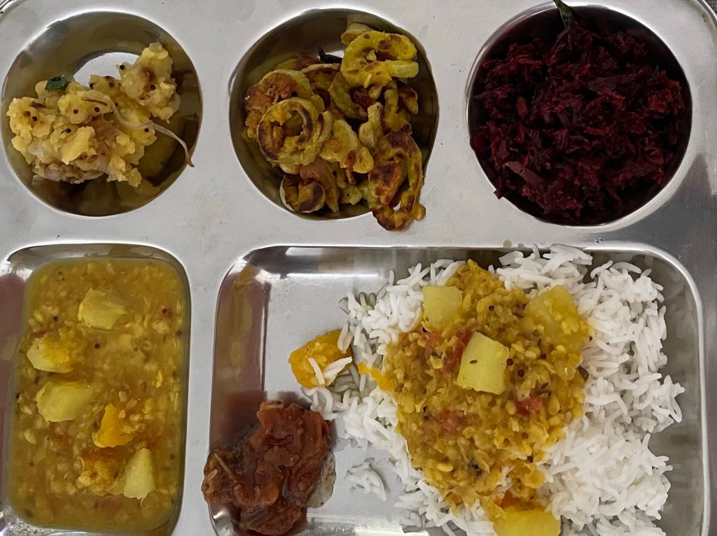 Monday thali – (Left to right on top) aloo bharta, chanchina pithou bhaja and beet root poriyal ( the South Indian addition) ; dalma, tomato khatta, bhaata